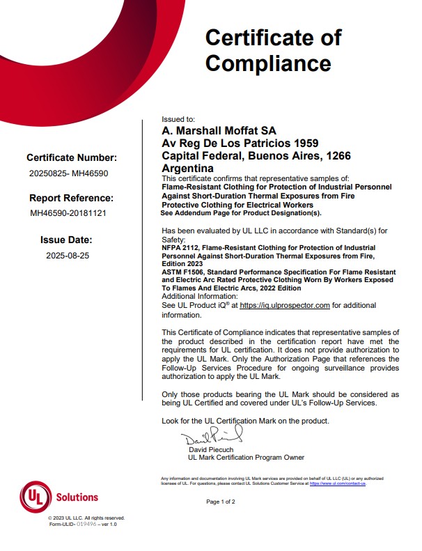 En A. Marshall Moffat tenemos como prioridad de gestión asegurar la calidad de nuestros productos, establecer acciones para la preservación del ambiente, la salud y la seguridad de nuestros empleados. Para garantizarlo, asumimos el compromiso de trabajar en conformidad con los requisitos de nuestros clientes, enfocando nuestro desempeño al cumplimiento de las normas nacionales e internacionales como ISO 14001:2015, ISO 9001:2015 y ISO 45001:2018. En la actualidad y desde el año 2013 A. Marshall Moffat es firmante del Pacto Global de las Naciones Unidas porque creemos que la única forma de lograr excelencia es consolidando nuestro desempeño en materia de gestión socialmente responsable.